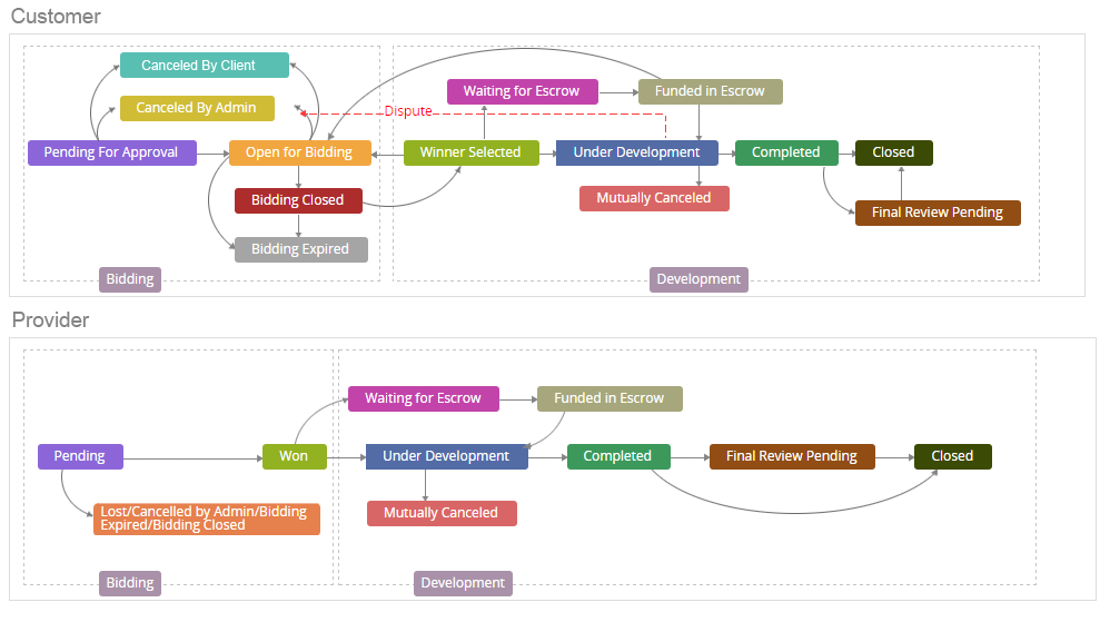 Once a Customer has posted a job, Providers can bid on it, the Customer rewards the person/company of his/her choice and the project starts. The Customer funds the amount both parties agreed on and releases the money only after satisfactory completion of the task by the Provider.